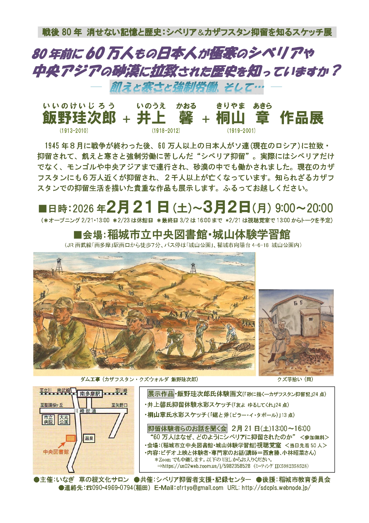 稲城市立中央図書館での展示は2021年12月に続いて4年ぶりです。今回はシベリアに比べて知られていないカザフスタン抑留を回想した体験者によるスケッチも展示します。